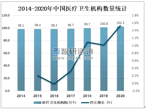 医疗质量和医疗安全直接关系到人民群众健康。近年来中国的医疗技术能力和医疗质量水平显著提升,持续构建优质高效医疗卫生服务体系,更好地满足了群众健康需求,为实施健康中国战略奠定了坚实的基础。2020年中国共有医疗卫生机构102.3万个,较2019年增加了1.54万个,同比增长1.5%。