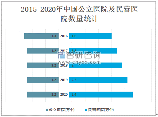 2020年中国公立医院为1.2万个,与2019年持平;民营医院为2.4万个,较2019年增加了0.2万个。