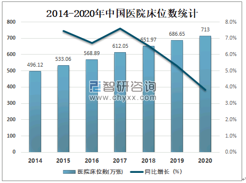 中国医院床位数快速增长,2020年中国医院床位数达713万张,较2019年增加了26.35万张,同比增长3.8%。