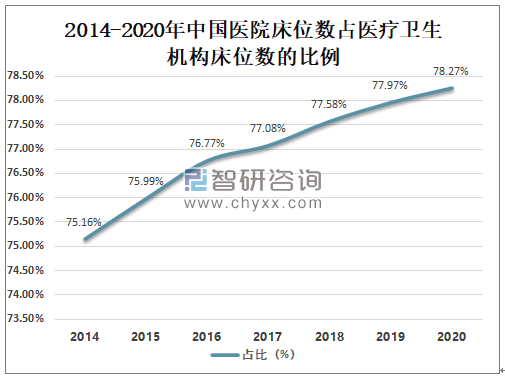 中国医院床位数占医疗卫生机构床位数的比例快速增长,2020年中国医院床位数占医疗卫生机构床位数的78.27%,较2019年增长了0.30%。