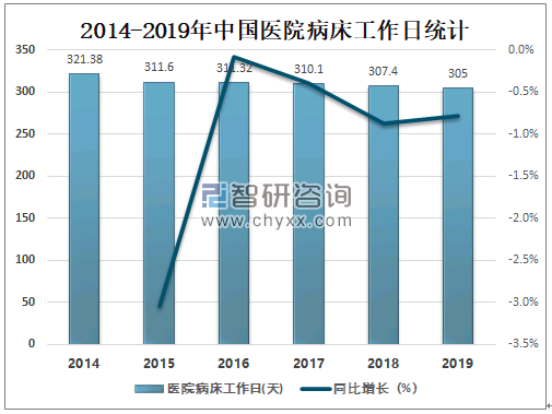 随着中国医疗水平的提升,中国医院病床工作日逐年下降,2019年中国医院病床工作日为305天,较2018年减少了2.4天,同比减少0.8%。