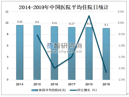 中国医院平均住院日逐年下滑,2019年中国医院平均住院日为9.1天,较2018年减少了0.2天,同比减少2.2%。
