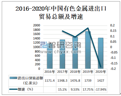 智研咨询发布的《2021-2027年中国有色金属行业市场全景调查及发展战略研究报告》数据显示:2019年有色金属行业进出口贸易总额1739亿美元,同比增长17.75%;2020年有色金属进出口贸易总额1427亿美元,较上年减少312亿美元,同比下降17.94%,
