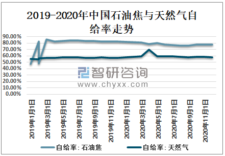 智研咨询发布的《2021-2027年中国石油和天然气开采行业市场全景调查及发展趋势研究报告》数据显示:据中国石油和化学工业联合会数据显示,2020年中国石油焦自给率为77.47%;中国天然气自给率为58.04%。