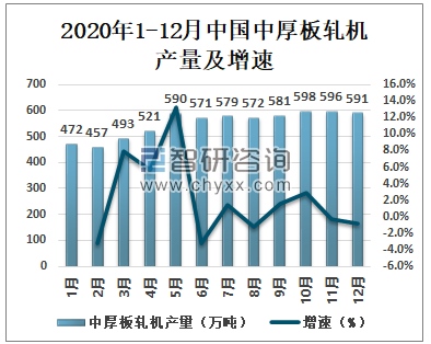 中厚板轧机是用于轧制中厚度钢板的轧钢设备。它主要用于制造交通运输工具、钢机构件、焊管及一般机械制品等。2020年1-12月份,中厚板轧机产量整体呈小幅上涨。12月份中厚板轧机生产特厚板、中厚板591万吨,较11月减少5万吨,同比下降0.84%。
