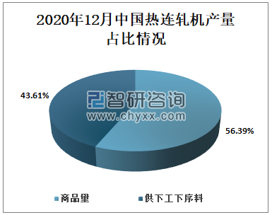 智研咨询发布的《2021-2027年中国板带材轧机行业发展现状及未来前景分析报告》数据显示:2020年12月我国热连轧机商品量891万吨,占热连轧机产量的56.39%;供下工序用料689万吨,占热连轧机产量的43.61%。