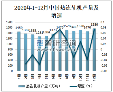 随着热轧复合板技术的发展,热连轧生产增加了新的品种。2020年1-12月我国热连轧机产量呈波动增长, 12月我国热连轧机产量1580万吨,较上月增加110万吨,同比增加7.48%。