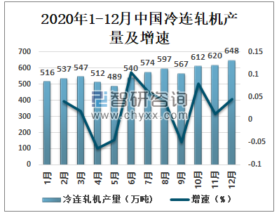 冷连轧是用热轧钢卷为原料,经酸洗去除氧化皮,冷轧产品广泛应用于汽车制造、家电产品,仪表开关、建筑、办公家具等行业。2020年1-12月我国冷连轧机产量呈波动上升趋势,12月我国冷连轧机产量648万吨,较上月增加28万吨,同比增长4.52%。