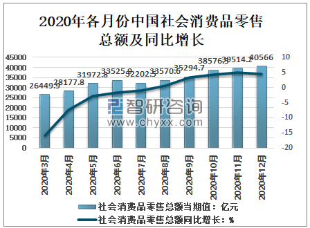 统计局数据显示,2020年中国社会消费品零售总额391981亿元,同比下降3.93%;自2020自8月起,社会消费品零售总额同比增长扭负为正。