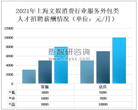 从上海文娱消费行业服务外包类人才招聘薪酬来看,店员的最高薪酬10000元/月,最低5000元/月;客服的最高薪酬8000元/月,最低3000元/月。