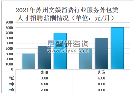 从文娱消费行业服务外包类人才招聘薪酬来看,2021年苏州文娱消费行业服务外包类店员的最高薪酬8000元/月;客服的最高薪酬7000元/月。