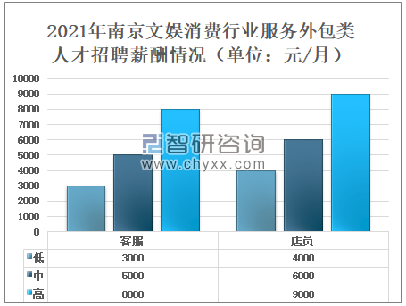 从南京文娱消费行业服务外包类人才招聘薪酬来看,店员的最高薪酬9000元/月,最低薪酬4000元/月;客服的最高薪酬8000元/月,最低薪酬3000元/月。