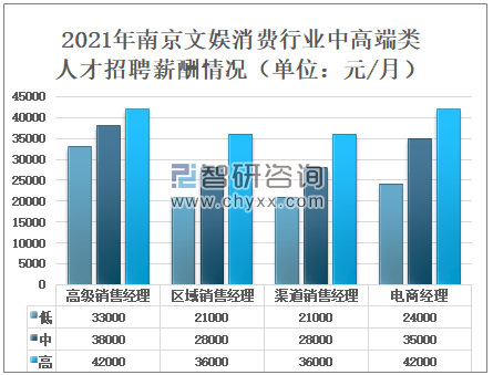 预计南京文娱消费行业中高端类高级销售经理、电商经理的薪酬最高可达42000元/月;区域销售经理、渠道销售经理人才招聘薪酬最高可达36000元/月。