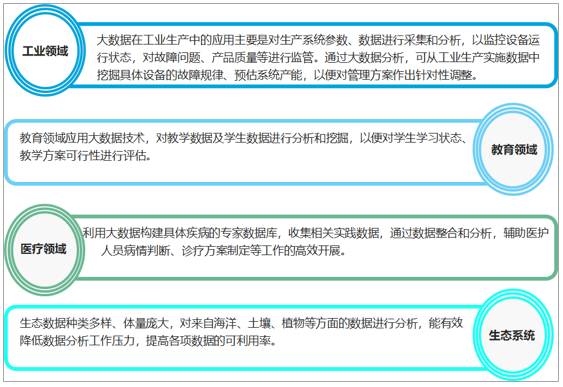 智研咨询发布的《2021-2027年中国大数据行业发展前景分析及战略咨询研究报告》数据显示:大数据发展势态迅猛,已在电子商务、教育、能源、科研、医疗等领域有着广泛的应用,并逐步参与到国家政务当中。相较于西方发达国家,我国大数据技术研究虽起步较晚,但到目前也取得了一定的成就,分析其发展现状和未来前景,有利于促进我国大数据研究和应用的进一步深入。