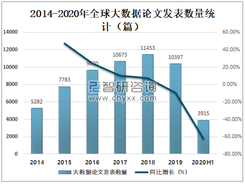 自2012年大数据广泛进入实际应用以来,产业界和学术界在大数据技术与应用方面的研究创新不断取得突破,大数据领域的论文发表数量和专利申请数量快速增长。在论文发表方面,2012年以来全球大数据论文发表数量逐年攀升,2018年更是达到历年来最高峰值,2018年全球大数据论文发表数量达11453篇,较2017年增了780篇,同比增长7.31%,2019年较2018年有所减少,但仍然超过一万篇,2020年1-6月全球大数据论文发表数量为3915篇,随着科学研究的不断进展,大数据相关的理论体系将逐渐成熟,未来学术论文成果发表的增长速度或将放缓。