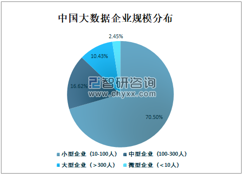 2020年我国大数据产业迎来新的发展机遇期,产业规模日趋成熟。大数据产业主体从“硬”设施向“软"服务转变的态势将更加明显,面向金融、政务、电信、医疗等领域的大数据服务将实现倍增创新,大数据与特定场景的结合度日益深化,应用成熟度和商业化程度将持续升级。2019年中国大数据领域的企业超3000余家,其中超70%的大数据企业为10人至100人规模的小型企业,在产业蓬勃向上的发展阶段离不开中小企业发挥其在创新创业中的重要作用。政策上伴随“新基建”成为拉动国内经济发展的新一轮驱动力,大数据中小企业面临的外部市场环境和依托的基础设施也发生重大变化从而影响企业规模分布。