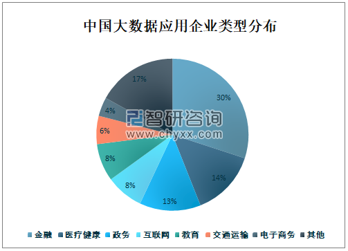 根据大数据企业的业务标签,将1404家涉及行业大数据应用的企业进行了统计整理,大数据行业应用的最主要类型主要集中在金融、医疗健康、政务、互联网和教育领域,其中金融领域的大数据应用企业占30%,占比最大;医疗健康领域的大数据应用企业占14%;政务领域的大数据应用企业占13%;互联网领域的大数据应用企业占8%;教育领域的大数据应用企业占8%。