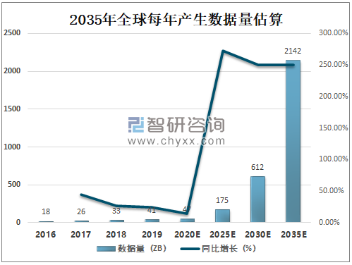 当前,全球数据量仍在飞速增长的阶段,预计2020年全球数据产生量将达到47ZB,较2019年增加6ZB,同比增长14.63%,而到2035年这一数字将达到2142ZB,未来全球数据量即将迎来更大规模的爆发。