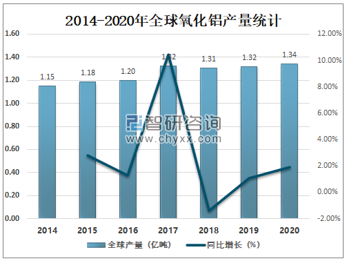 2014-2020年全球氧化铝产量统计