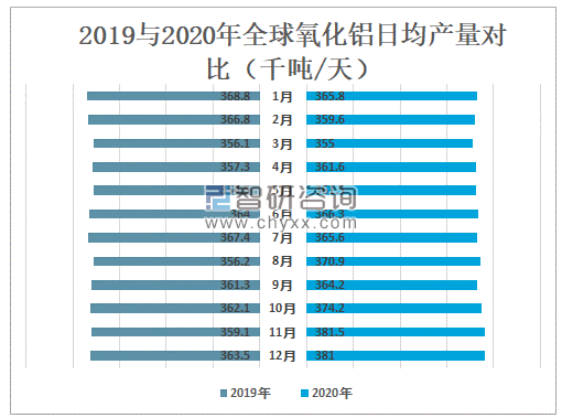 2019与2020年全球氧化铝日均产量对比