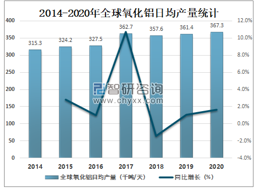 随着氧化铝产量技术的不断提升,全球氧化铝日均产量快速增长,2020年全球氧化铝日均产量达367.3千吨/天,较2019年增加了5.9千吨/天,同比增长1.6%。