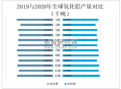 智研咨询发布的《2021-2027年中国氧化铝行业产业运营现状及战略咨询研究报告》数据显示:从月度数据来看,2020年除1月、3月、7月外,其余月份均全球氧化铝产量高于2019年同期,2020年12月全球氧化铝产量为11810千吨,较2019年同期增加了540千吨。
