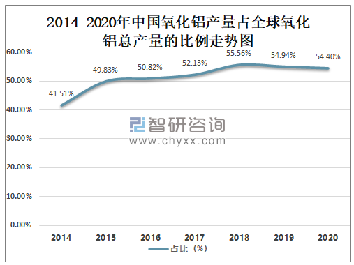 2014-2020年中国氧化铝产量占全球氧化铝总产量的比例走势图