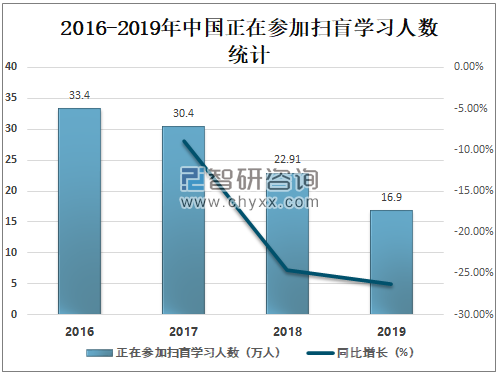 智研咨询发布的《2021-2027年中国教育行业市场竞争现状及发展趋势分析报告》数据显示:2019年中国正在参加扫盲学习人数为16.9万人,较2018年减少了6.01万人,同比减少26.23%。
