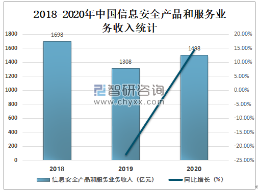中国信息安全行业起步较晚,自本世纪初以来经历了三个重要发展阶段(萌芽、爆发和普及阶段),产业规模逐步扩张。尤其是近年来,各类网络威胁造成的损害不断增强,带动了市场对信息安全产品和服务需求的持续增长;另外,政府重视和政策扶持也不断推动我国信息安全产业的快速发展。2020年中国信息安全产品和服务业务收入达1498亿元,较2019年增加了190亿元,同比增长14.53%。