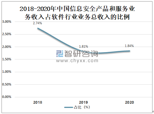 智研咨询发布的《2021-2027年中国信息安全行业市场发展模式及战略咨询研究报告》数据显示:总体来看中国信息安全产品和服务业务收入占软件行业业务总收入的比例呈下滑趋势,2020年中国信息安全产品和服务业务收入占软件行业业务总收入的1.84%,较2018年的2.74%减少了0.91%。