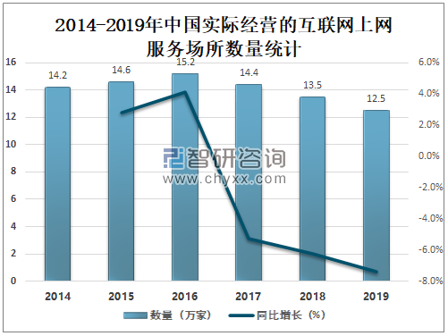 2014-2019年中国实际经营的互联网上网服务场所数量统计