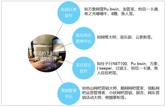 上网服务场所的经营离不开管理软件,中国互联网上网服务场所常用的上网服务场所软件有收银计费软件,如万象网管Pubwin、龙管家、恒信一卡通、希之光嘟嘟牛、8圈、鱼人等;娱乐综合管理平台,如网维大师、易乐游、云更新等;实名登记软件,如任子行NET100、Pubwin、万象、Ikeeper、过滤王、恒信一卡通、鱼人旺旺吧等;营销管理平台,如他山网吧营销大师、顺网网吧管家、领航网吧运营管理者、小妖网吧营销、银杏、网乐营销活动大师、熊猫掌柜等。