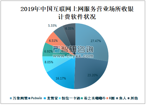 智研咨询发布的《2021-2027年中国软件行业市场发展潜力及投资盈利分析报告》数据显示:中国互联网上网服务营业场所收银计费软件方面,2019年中国场所经常使用的计费软件主要有顺网旗下万象网管,上海新浩艺软件有限公司旗下Pubwin,深圳市任网游科技发展有限公司旗下龙管家,恒信一卡通,深圳市希之光科技有限公司旗下希之光嘟嘟牛等,其中万象网管占27.47%,占比最大;Pubwin占23.20%;龙管家占16.17%;恒信一卡通占8.05%;希之光嘟嘟牛占6.92%;8圈占6.51%;鱼人占5.33%。