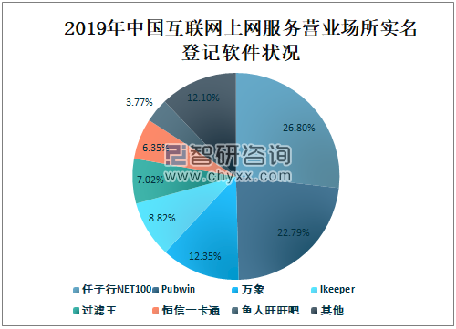 2019年中国互联网上网服务营业场所实名登记软件种类较多,任子行NET100和Pubwin占据了一半左右的市场份额,其他常见的实名登记软件还有万象、Ikeeper、过滤王、恒信一卡通等等,其中任子行NET100占26.80%,占比最大;Pubwin占22.79%;万象占12.35%;Ikeeper占8.82%;过滤王占7.02%;恒信一卡通占6.35%;鱼人旺旺吧占3.77%。