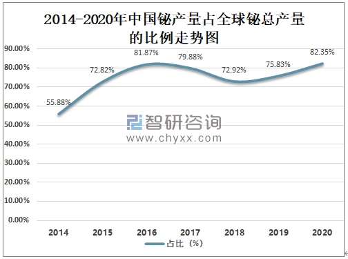 2014-2020年中国铋产量占全球铋总产量的比例走势图