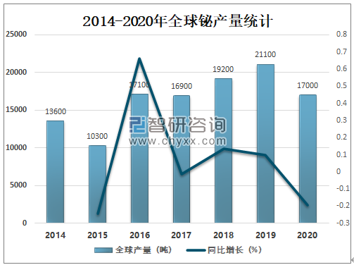 智研咨询发布的《2021-2027年中国铋行业市场供需形势及投资策略研究报告》数据显示:铋在地壳中的含量不大,为2×10-5%,自然界中铋以单质和化合物两种状态存在,主要矿物有辉铋矿(Bi2S3)、泡铋矿(Bi2O3)、菱铋矿(nBi2O3·mCO2·H2O)、铜铋矿(3Cu2S·4Bi2S3)、方铅铋矿(2PbS·Bi2S)。2019年全球铋产量达21100吨,较2018年增加了1900吨,同比增长9.9%,2020年较2019年有所下滑,2020年全球铋产量为17000吨,较2019年减少了4100吨,同比减少19.43%。
