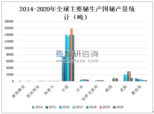 世界主要产铋国分别为中国、玻利维亚、保加利亚、加拿大、日本、哈萨克斯坦、韩国、老挝、墨西哥等。2020年中国铋产量为14000吨,较2019年减少了2000吨;玻利维亚铋产量为10吨,较2019年减少了5吨;保加利亚铋产量为40吨,较2019年减少了10吨;加拿大铋产量为20吨,较2019年减少了5吨;日本铋产量为480吨,较2019年减少了60吨;哈萨克斯坦铋产量为240吨,较2019年减少了30吨;韩国铋产量为830吨,较2019年减少了100吨;老挝铋产量为1000吨,较2019年减少了2000吨;墨西哥铋产量为270吨,较2019年减少了30吨。