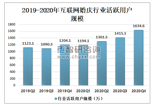 2020疫情期间,线下备婚受阻,“云备婚”模式为新人提供便利,互联网婚庆用户迎来小高潮。截至2020年Q4,我国互联网婚庆行业活跃用户规模达1634.6万,较上季度增加219.5万,同比上升15.51%。