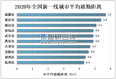 智研咨询发布的《2021-2027年中国城市交通行业市场经营管理及投资前景预测报告》数据显示:通勤距离是指从家到实际就业地的距离,中心城区通勤人口的平均通勤距离,是城市职住分离情况的真实写照。2020年,全国新一线城市平均通勤距离最长的是成都市、重庆市及南京市,达到5.7km、5.4km、5.1km;其次青岛市、武汉市、西安市平均通勤距离均为4.9km。