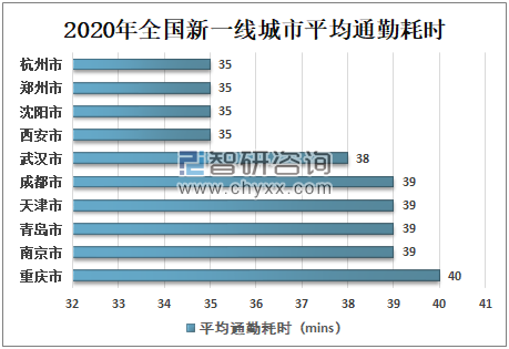 36分钟是全国主要城市通勤人口的单程平均时耗。从平均通勤时间来看,全国新一线城市平均通勤耗时最短的是杭州市、郑州市、沈阳市、西安市,平均通勤耗时均为35mins;其次武汉市平均通勤耗时38mins;成都市、天津市、青岛市、南京市平均通勤耗时均为39mins。