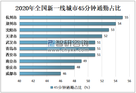 45钟内通勤比重占得越少,说明这个城市的总体通勤时间就越长,反之亦然。2020年,全国新一线城市45分钟通勤占比最高的是杭州市、郑州市、沈阳市,占比分别是55%、54%、53%;其次天津市45分钟通勤占比52%;武汉市、青岛市、西安市45分钟通勤占比均为51%。