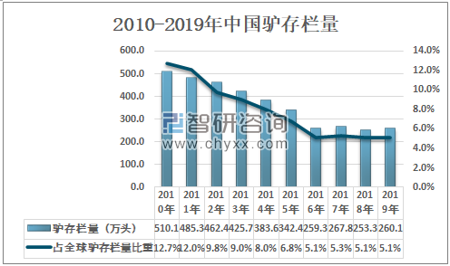2010-2019年中国驴存栏量