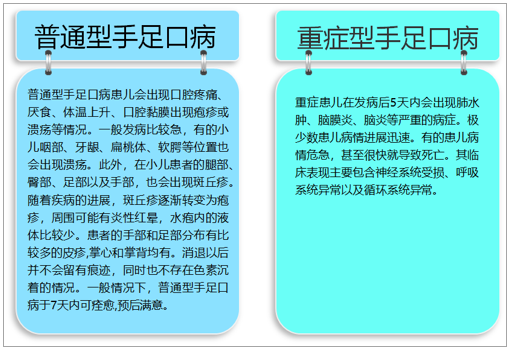 手足口病主要包含重症型及普通型两类。普通型手足口病患儿会出现口腔疼痛、厌食、体温上升、口腔黏膜出现疱疹或溃疡等情况。一般发病比较急,有的小儿咽部、牙龈、扁桃体、软腭等位置也会出现溃疡。此外,在小儿患者的腿部、臀部、足部以及手部,也会出现斑丘疹。随着疾病的进展,斑丘疹逐渐转变为疱疹,周围可能有炎性红晕,水疱内的液体比较少。患者的手部和足部分布有比较多的皮疹,掌心和掌背均有。消退以后并不会留有痕迹,同时也不存在色素沉着的情况。一般情况下,普通型手足口病于7天内可痊愈,预后满意。重症患儿在发病后5天内会出现肺水肿、脑膜炎、脑炎等严重的病症。极少数患儿病情进展迅速。有的患儿病情危急,甚至很快就导致死亡。其临床表现主要包含神经系统受损、呼吸系统异常以及循环系统异常。