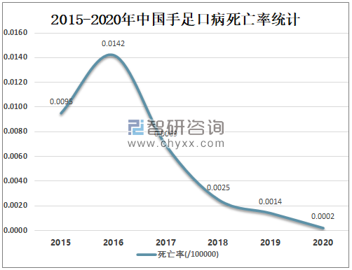 自2017年开始中国手足口病死亡率逐年下滑,2020年中国手足口病死亡率为0.0002/10万,较2015年的0.0095/10万减少了0.0093/10万。