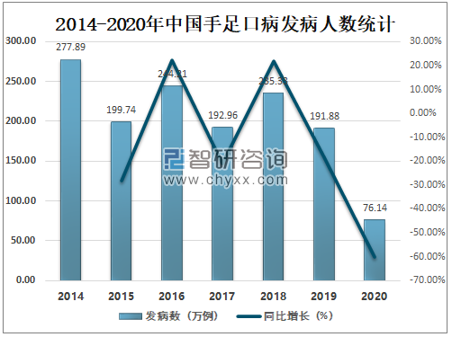 手足口病是全球关注的公共卫生问题,对婴幼儿健康造成巨大威胁,2020年中国手足口病发病人数为76.14万例,较2019年减少了115.75万例,同比减少60.32%。
