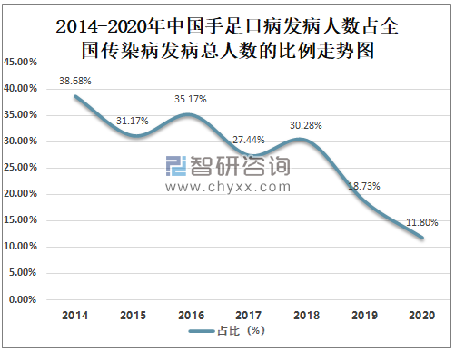 总体来看中国手足口病发病人数占全国传染病发病总人数的比例呈下滑趋势,2020年中国手足口病发病人数占全国传染病发病总人数的11.80%,较2014年的38.68%减少了26.88%。