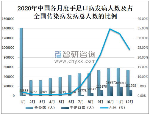 2020年中国各月度手足口病发病人数及占全国传染病发病总人数的比例
