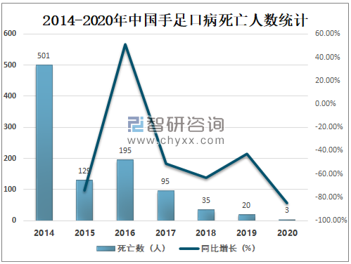 随着医疗水平的不断提升,中国手足口病死亡人数逐年减少,2020年中国手足口病死亡人数为3人,较2019年减少了17人,同比减少85%。