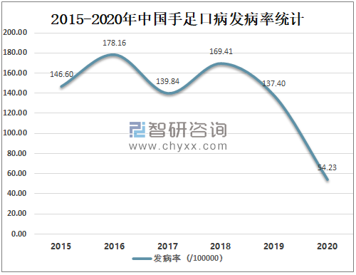 总体来看中国手足口病发病率呈下滑趋势,2020年中国手足口病发病率为54.23/10万,较2015年的146.6/10万减少了92.36/10万。