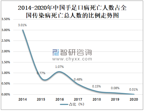 总体来看中国手足口病死亡人数占全国传染病死亡总人数的比例呈下滑趋势,2020年中国手足口病死亡人数占全国传染病死亡总人数的0.01%,较2014年的3.01%减少了3%。
